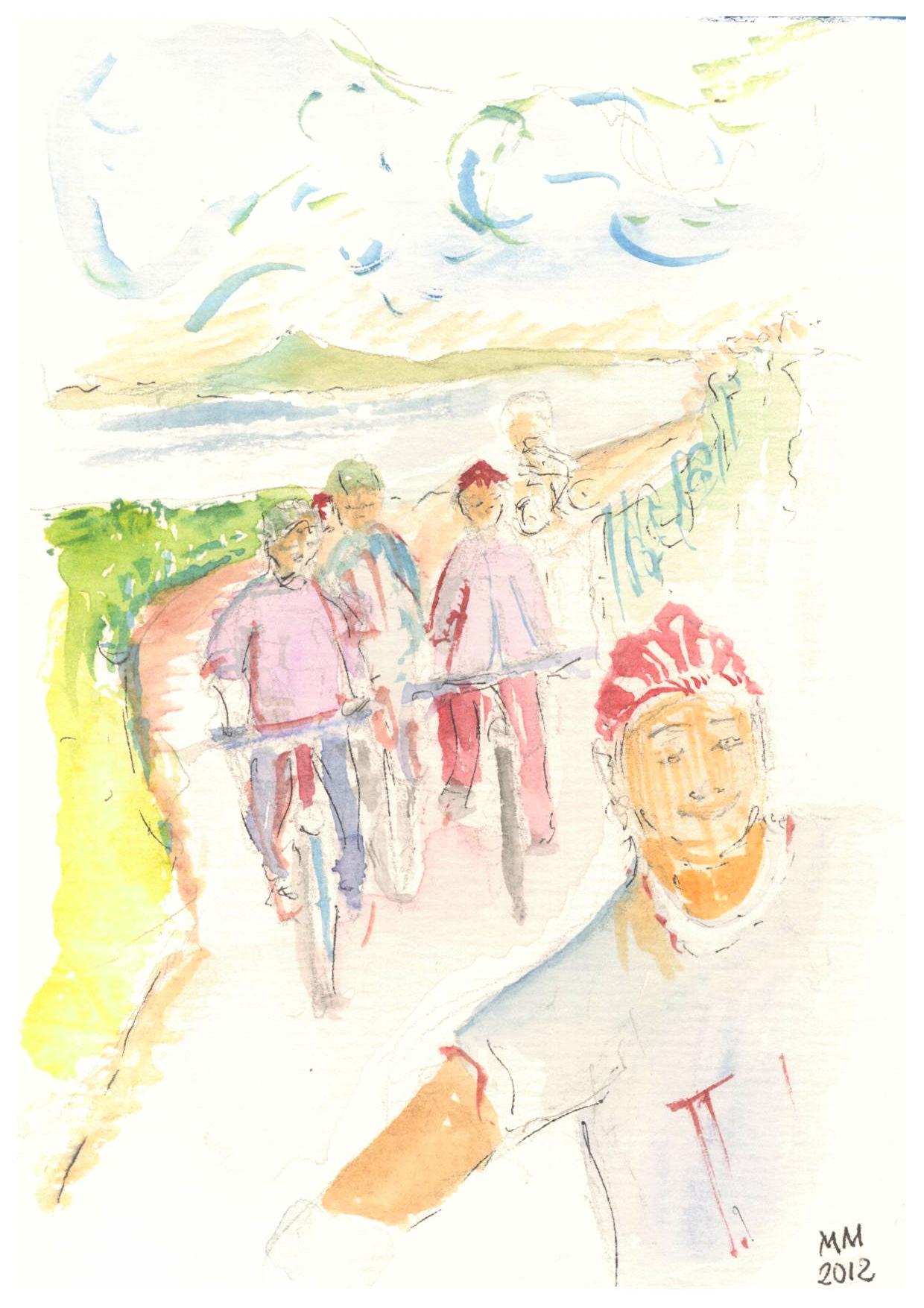 Campingplatz den Berg hinausläuft und einem Waldweg folgend unendlich viele Vögel hört und sieht, auch alte Pappelhaine.